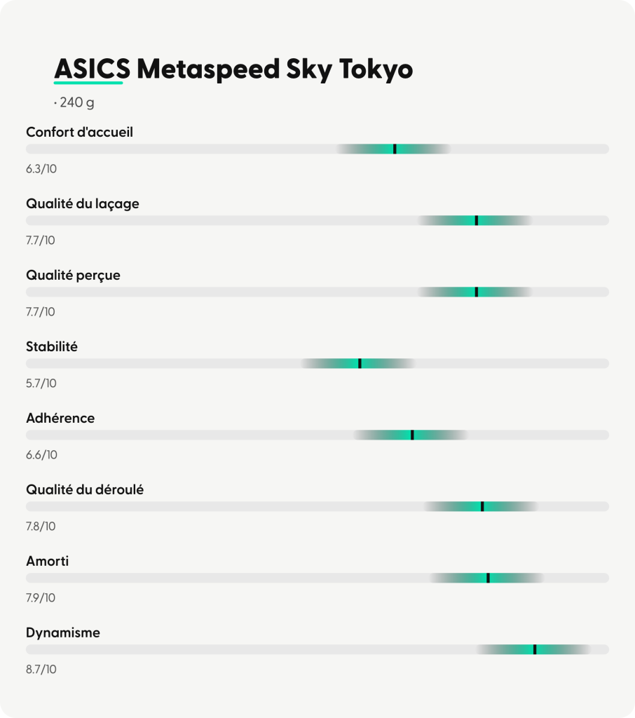 Les retours des 20 testeurs confirment le positionnement très marqué de la Metaspeed Sky Tokyo comme une chaussure de performance pure, destinée à des coureurs expérimentés recherchant vitesse et rendement, au détriment relatif du confort et de la tolérance.