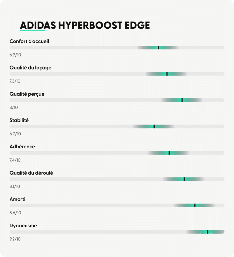 ➜ En conclusion, la adidas Hyperboost Edge se révèle comme une daily trainer atypique, très dynamique et polyvalente, mais exigeante. Elle séduira les coureurs intermédiaires à confirmés, à la recherche d’une chaussure capable de dynamiser leurs footings et d’aller vers des allures soutenues, tout en conservant un bon niveau de confort. Moins adaptée aux débutants ou à ceux recherchant avant tout sécurité et douceur, elle s’adresse à ceux qui veulent mettre du rythme dans leur quotidien.