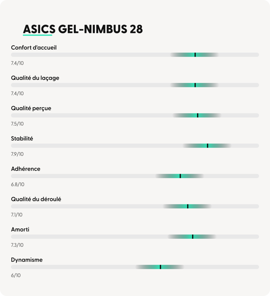 ➜ À l’issue des retours recueillis auprès de 20 testeurs, la ASICS Gel-Nimbus 28 confirme clairement son positionnement de daily trainer orientée confort, endurance fondamentale et récupération. Le modèle est globalement perçu comme une chaussure rassurante, protectrice et accessible, davantage pensée pour accumuler les kilomètres à allure modérée que pour les séances rythmées.