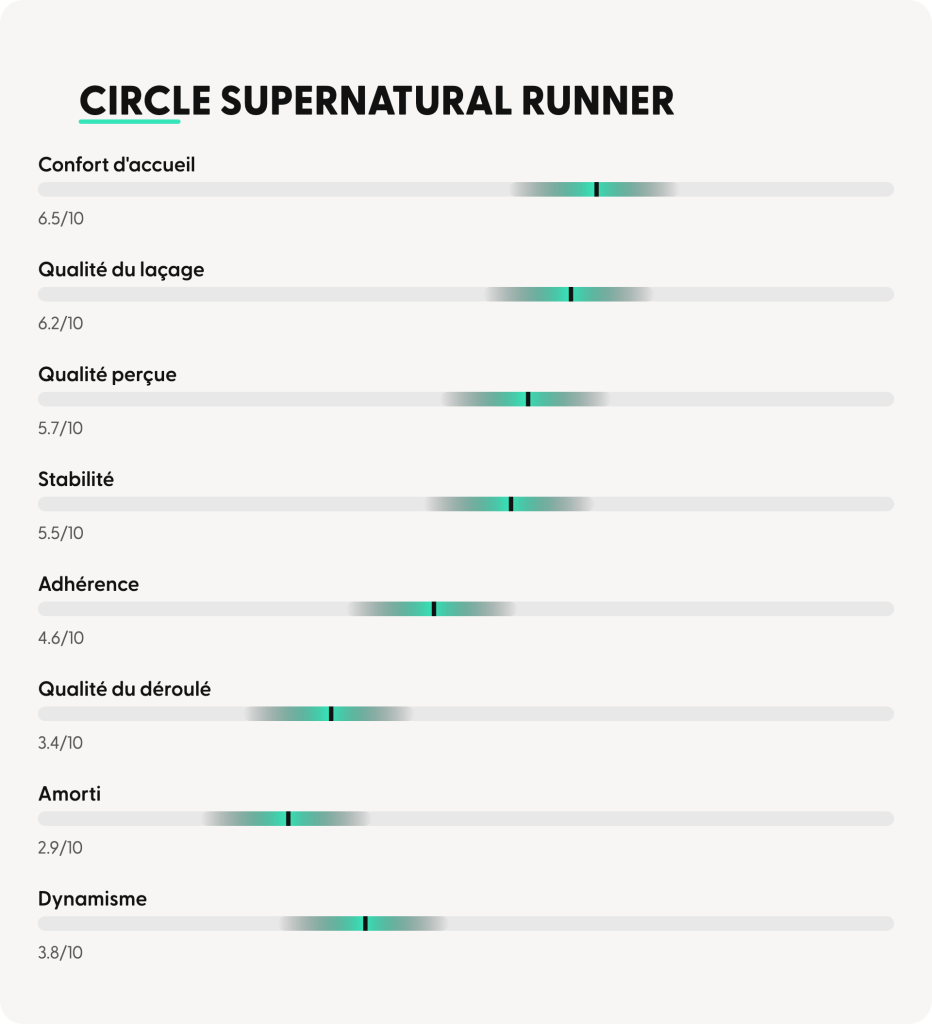 ➜ La Circle Supernatural Runner se distingue immédiatement par un positionnement singulier sur le segment daily trainer. Les retours des 20 testeurs mettent en avant une chaussure au caractère affirmé, qui ne laisse pas indifférent et propose une alternative différenciante aux standards actuels du marché.