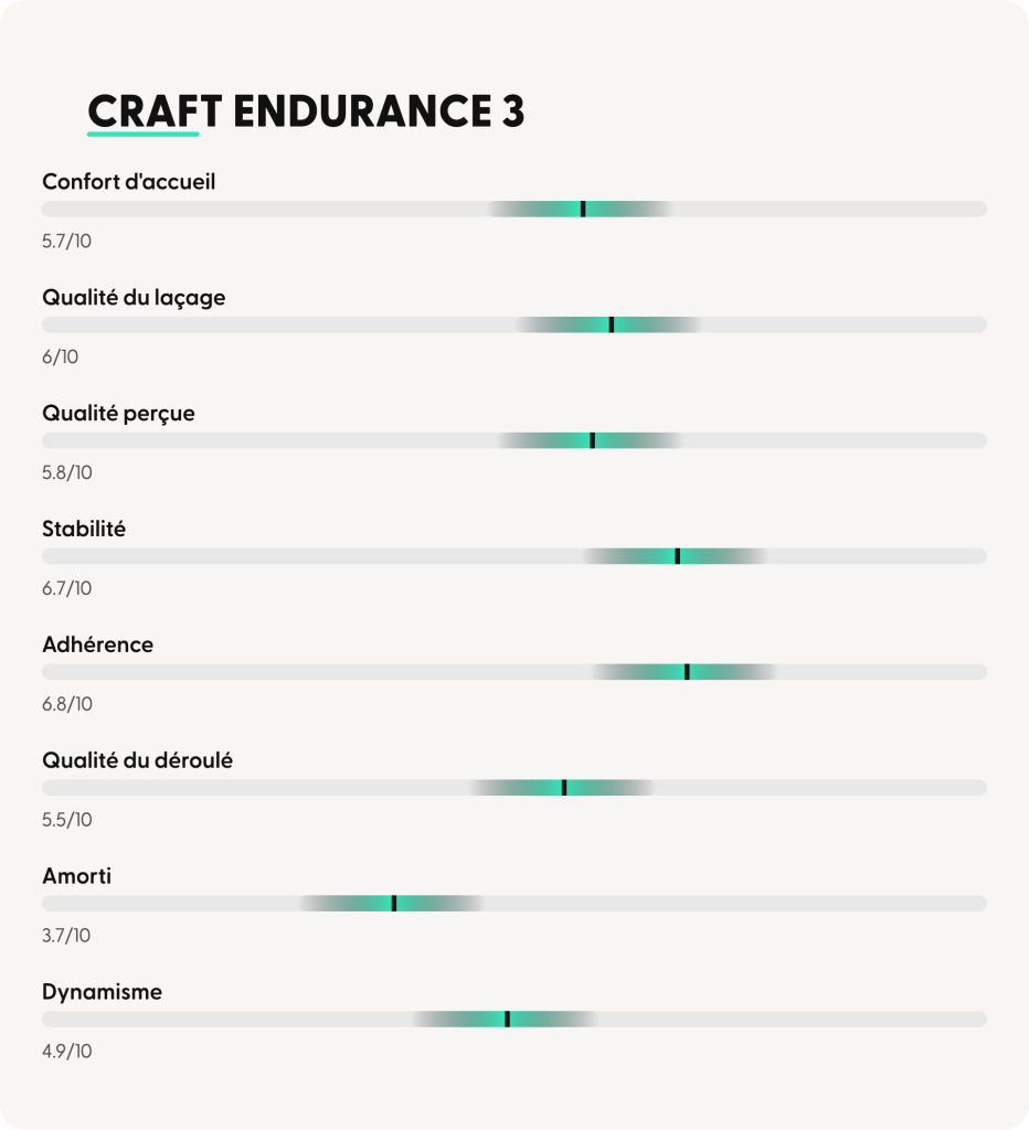 ➜ La Craft Endurance 3 se positionne comme une daily trainer au tempérament affirmé, avec une identité produit claire : une chaussure légère, stable et orientée vers les coureurs recherchant un ressenti direct du sol ainsi qu’une foulée active. Les retours des 20 testeurs mettent en avant une perception homogène sur plusieurs points clés, ce qui confirme la cohérence du modèle.