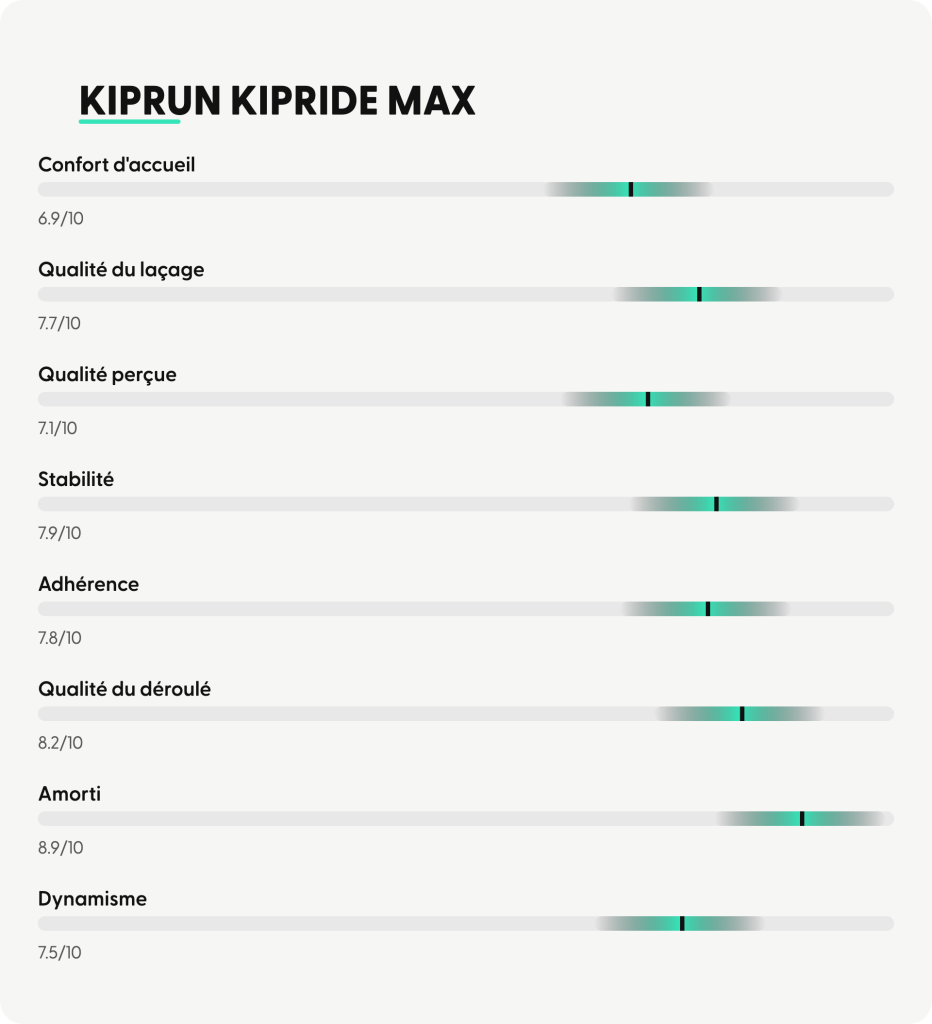 ➜ Finalement, la Kipride Max se positionne comme une daily trainer très confortable, stable et rassurante, idéale pour les footings, la récupération et les longues distances à allure modérée. Elle conviendra particulièrement aux coureurs recherchant protection et douceur, notamment les profils débutants à intermédiaires, tout en offrant suffisamment de dynamisme pour ne jamais rendre la foulée monotone.