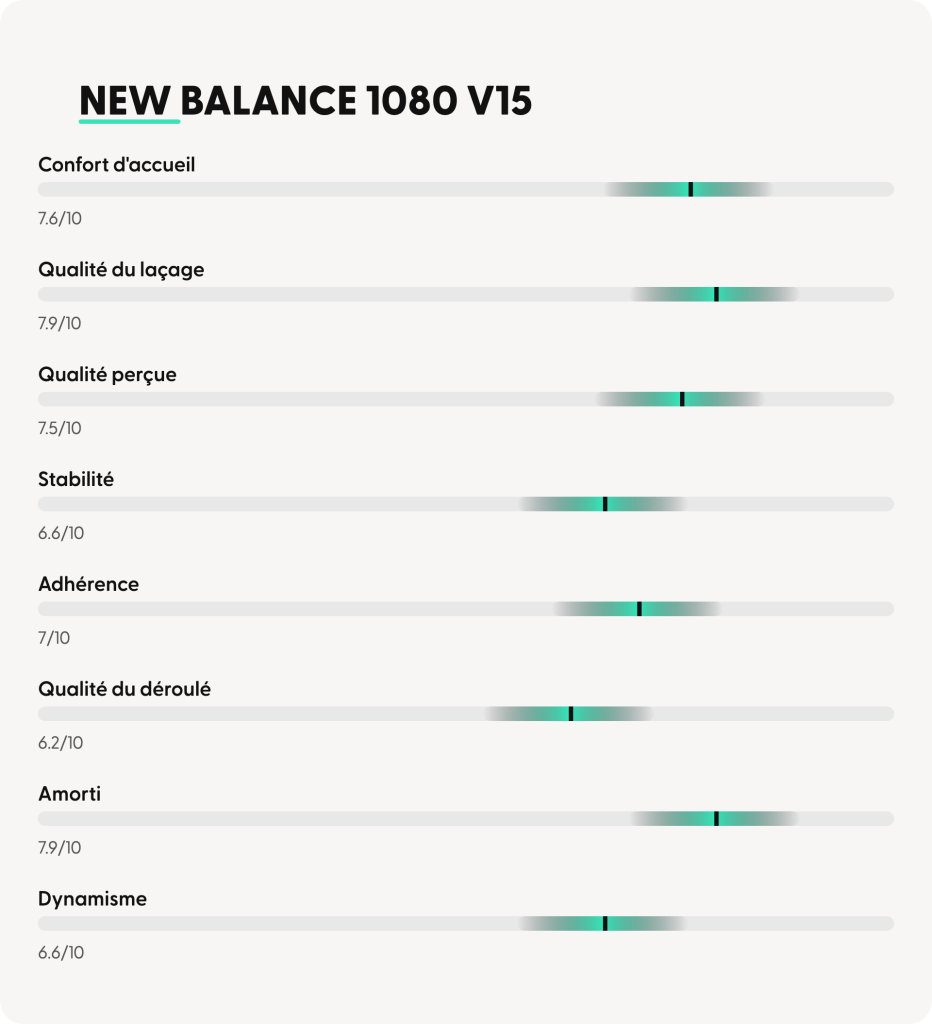 ➜ La New Balance Fresh Foam X 1080 v15 confirme clairement son positionnement de daily trainer premium orientée confort, pensée avant tout pour les footings quotidiens, les sorties longues tranquilles et la récupération. Sur l’ensemble des 20 testeurs, le ressenti dominant met en avant un chaussant accueillant, un amorti généreux et une expérience globale très accessible, rassurante et agréable.