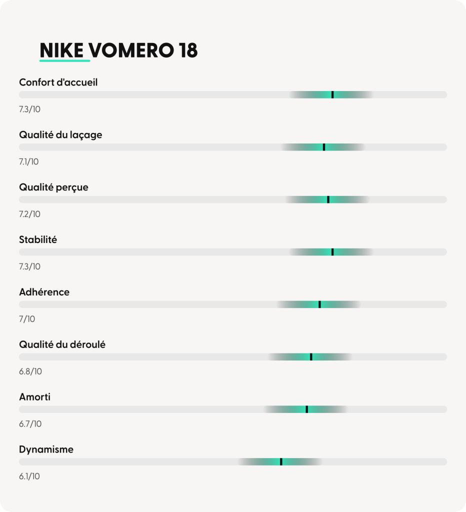 ➜ En conclusion, la Nike Vomero 18 apparaît comme une chaussure confortable, stable et protectrice, idéale pour les footings lents et la récupération, mais limitée par un manque de dynamisme et un chaussant assez étroit.