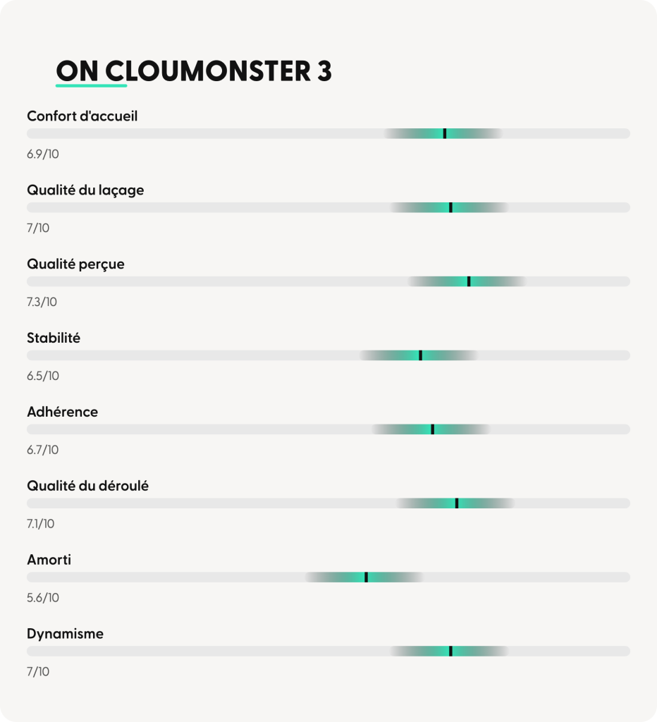 ➜ En synthèse, la Cloudmonster 3 apparaît comme une chaussure orientée performance et dynamisme, intéressante pour les allures soutenues, mais moins convaincante dans un usage quotidien confortable et stabilisé.