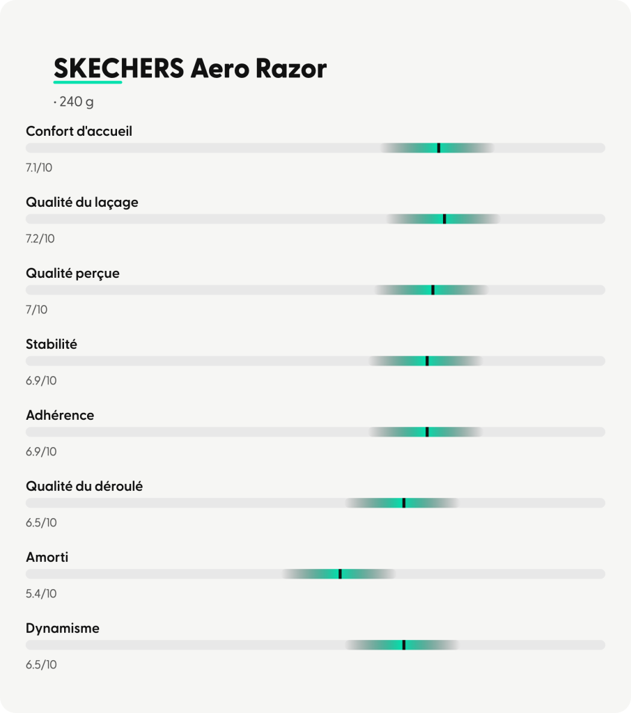 « La Skechers Aero Razor offre une bonne respirabilité et un chaussant confortable qui enveloppe bien le pied, avec un talon agréable sans points de pression. Elle se montre adaptée aux allures tranquilles et aux usages occasionnels. Elle reste limitée pour la performance en raison d’un amorti et d’un dynamisme modestes, ainsi qu’une stabilité perfectible à l’avant-pied. »