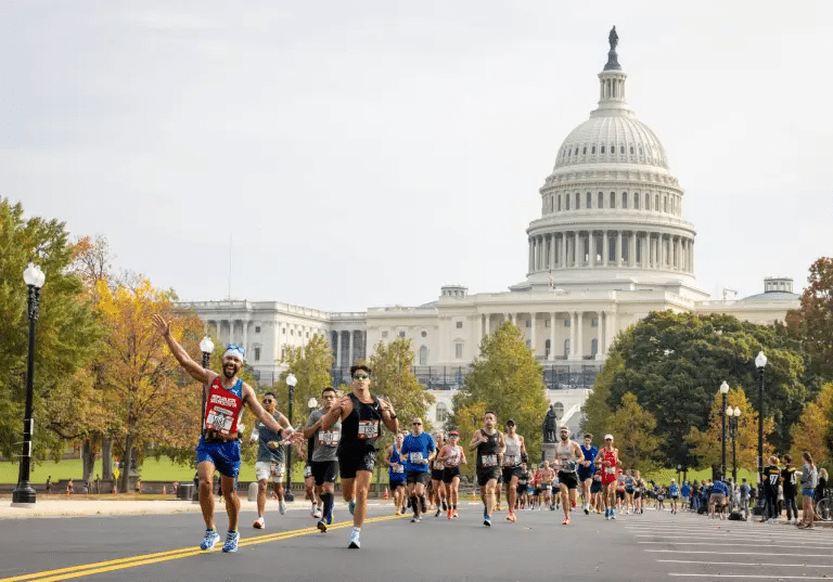 Le Marine Corps Marathon est une course traditionnelle qui a lieu à Washington, la capitale des États-Unis. Elle commence dans une émotion intense. Les runners sont enfin prêts sur la ligne départ quand l’hymne américain retentit, dans un silence de cathédrale. Puis un coup de canon marque le départ, comme un symbole de courage et de mémoire à ceux engagés dans l’armée. Le parcours longe le Capitole, traverse les quartiers symboliques de la capitale américaine et rend hommage aux vétérans avec des passages devant le Cimetière d’Arlington ou encore le Memorial Lincoln. Le ton est donné : ce marathon, c’est autant une course qu’un hommage aux militaires tombés au combat.