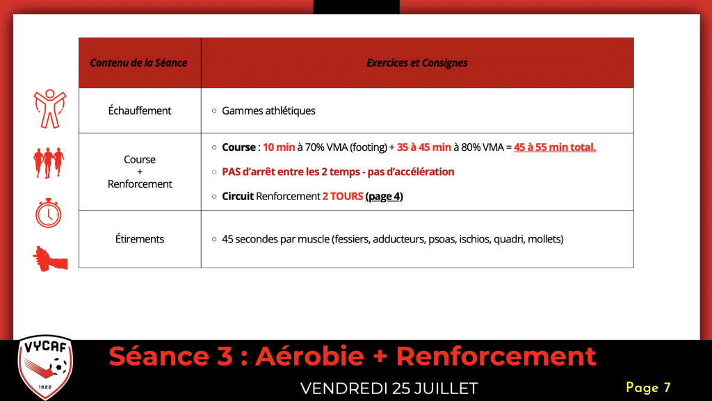 D’où l’importance de bien répartir le travail entre effort long et effort intermittent, deux sollicitations qui n’agissent pas de la même manière sur l’organisme. Concrètement, la saison peut débuter par une phase majoritairement axée sur le footing, sur une semaine et demie à deux semaines, souvent en période de préparation. Progressivement, le travail se rapproche ensuite d’efforts intermittents, intégrés aux séances de jeu classiques avec ballon, en demandant davantage de rythme aux joueurs. Ces séances prennent la forme de formats bien connus : 30/30 (30 secondes d’effort, 30 de récupération), 30/15, puis, en affinant, du 15/15, du 10/10, du 10/20, voire du 5/25. « Le travail intermittent dépend aussi des résultats au test VMA, de la capacité à soutenir des efforts longs en utilisant l’oxygène », précise Mourad. L’objectif : adapter les charges et constituer des groupes de travail cohérents selon le profil et les capacités de chacun.