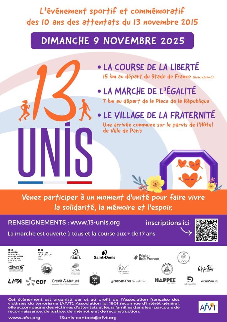 La course 13-Unis verra le jour le 9 novembre prochain, en hommage aux victimes des attentats du 13 novembre 2015. Cette initiative solidaire, commémorative et sportive portée par l’AfVT est née de la volonté de rassembler coureurs et marcheurs, dix ans après les événements qui ont profondément marqué la France. La course de la Liberté (15 km) partira du parvis du Stade de France, tandis que la marche de l’Égalité (7 km) s’élancera depuis la place de la République. Tous les participants se retrouveront ensuite au village de la Fraternité, sur le parvis de l’Hôtel de Ville de Paris. Deux épreuves, un symbole fort : l’espoir et la solidarité réunis dans un même élan collectif.